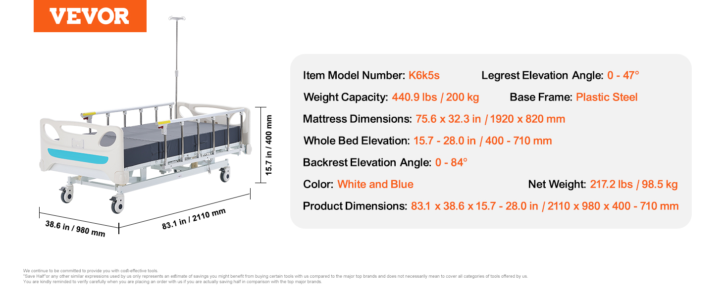 - 3 Upgraded Functions: Experience unparalleled comfort with VEVOR full electric hospital bed's 3 adjustable functions. Effortlessly adjust the full bed elevation (15.7 - 28.0 in), backrest angle (0-84°), and leg position (0-47°) to suit your needs. Whether you need to lie down for rest or sit up to read or watch TV, this hospital bed adapts to your preferences.